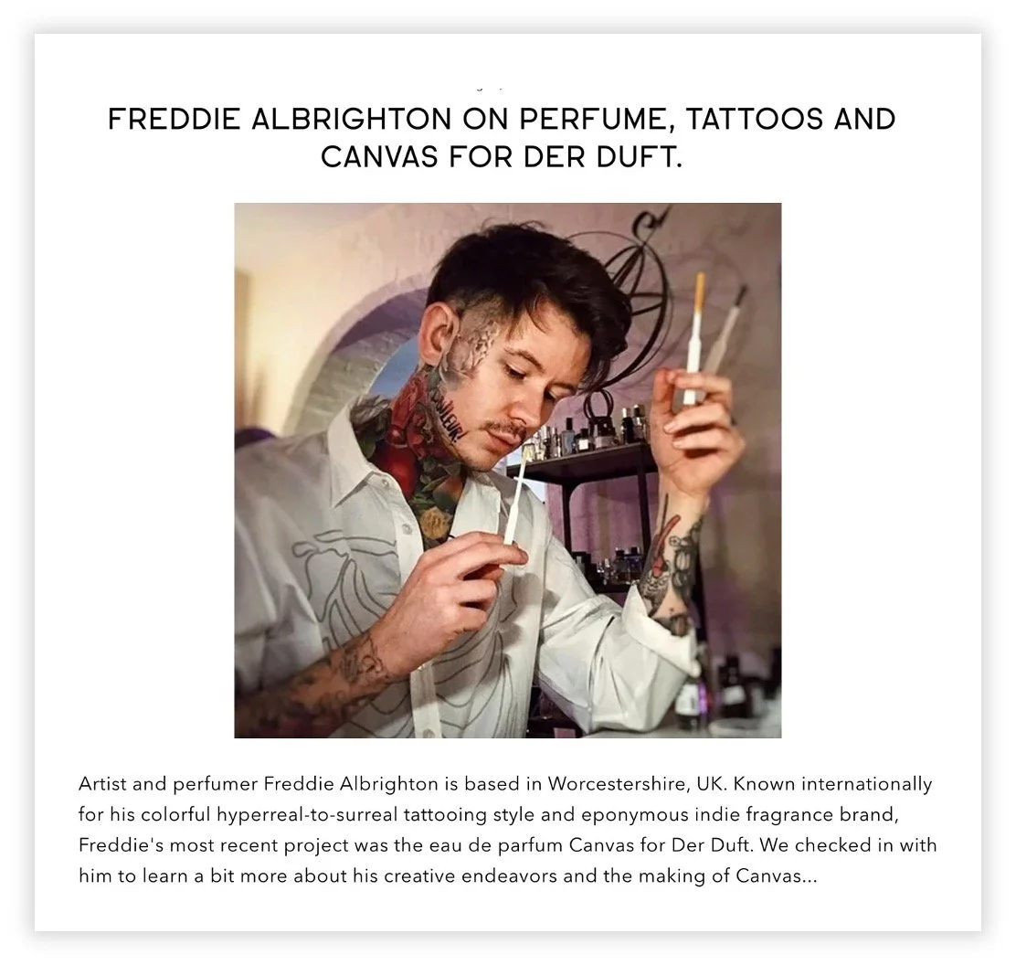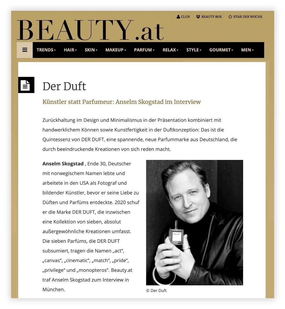 FREDERIKS FINEST - 2024/06 PLEZUROMAG - 2024/03 BEAUTY.AT - 2023/03 FINEST ON TOUR - 2023/03 EVERFUMED - 2022/04 MINISTRY OF SCENT - 2021/08 PARFUMO - 2021/03 FRAGROOM.COM - 2021/01 MINISTRY OF SCENT - 2022/05 PORSCHE CLUB LIFE MAGAZIN - 2023/03